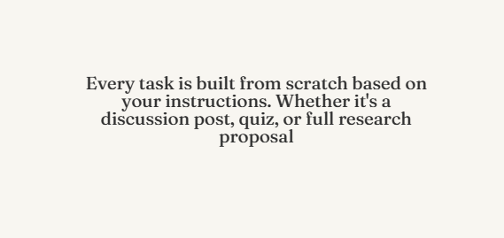 Every task is built from scratch based on your instructions. Whether it's a discussion post, quiz, or full research proposal, it aligns perfectly with your voice and course requirements.